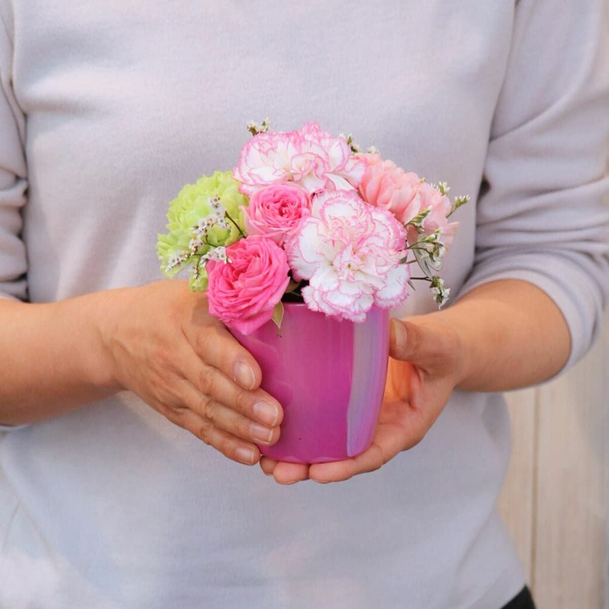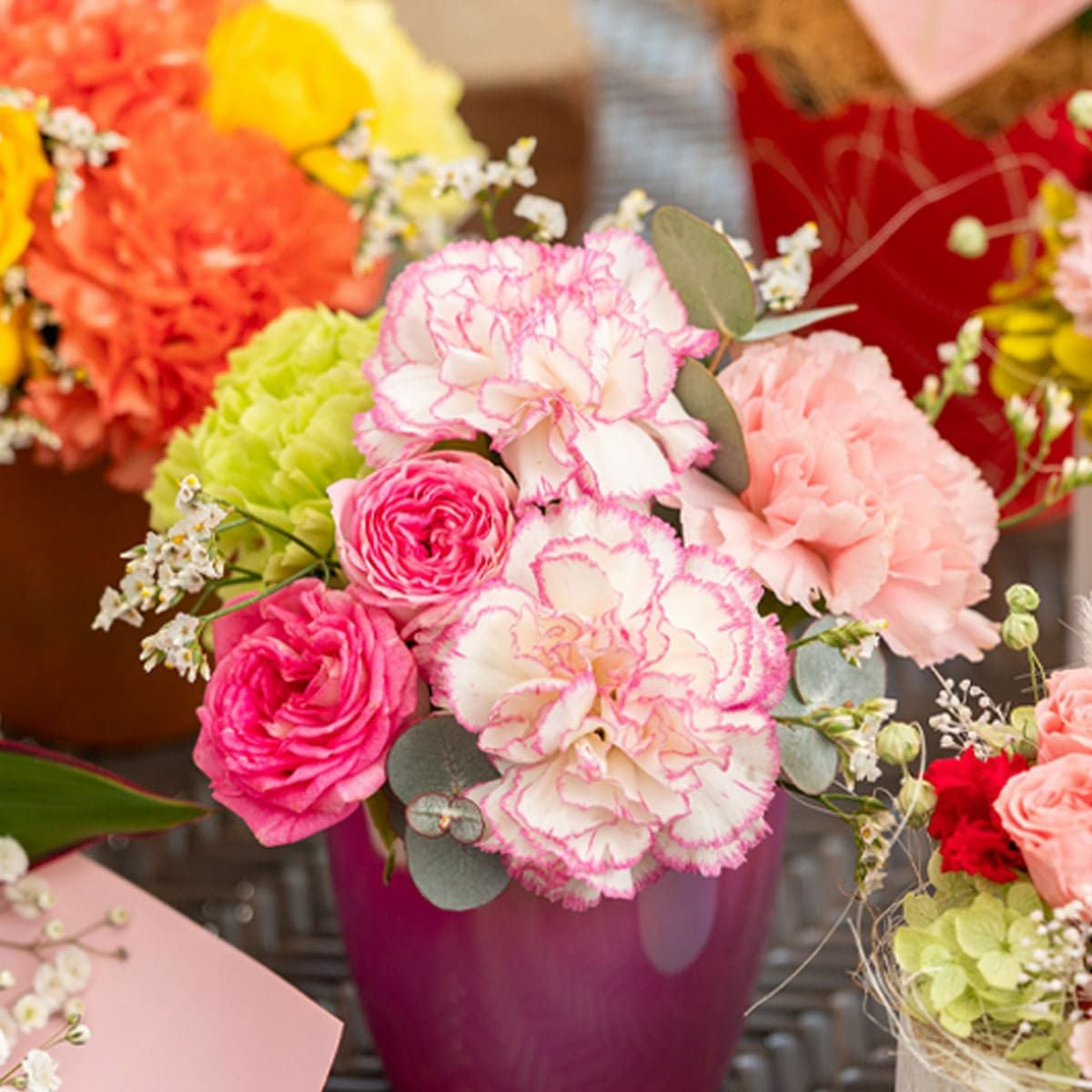カーネーションとバラを組み合わせたオリジナルのアレンジメントやブーケをはじめ、