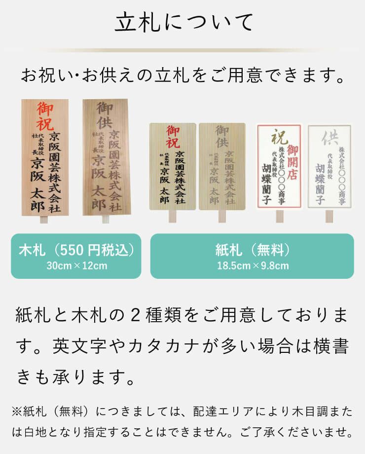 お祝い・お供えの立札をご用意できます。英文字やカタカナが多い場合は横書きも承ります。